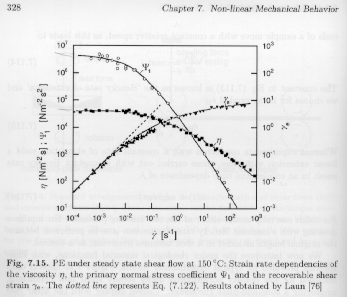 Figure 7.15 shows the recoverable shear strain, ge, that is proportional to the recoverable shear compliance, Je = ge/szx. At low strain rates the recoverable shear strain is just linear in the rate of strain as indicated by the dashed line. The linear behavior occurs in the regime where the viscosity and first normal stress coefficient are constant. In fact, the dashed line follows a linear function of the viscosity and first normal stress coefficient,